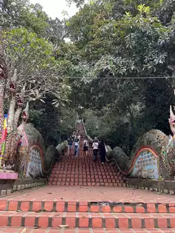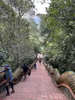 To reach the temple, visitors can climb a 306-step Naga staircase or take a convenient cable car. Once at the top, they are rewarded with serene surroundings, mountain air, and stunning panoramas.