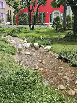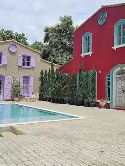 99 Villa & Cafe is a vibrant escape that doesn't aim to be sleek or trendy. Instead, it bursts with bright colors—pink, blue, yellow—lush greenery, a small European-style house, and an abundance of trees that make you feel like you've stepped into a perfume commercial. And yes, there are actual geese strolling by the pond—no joke.