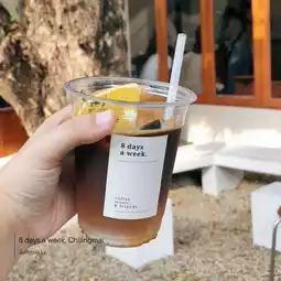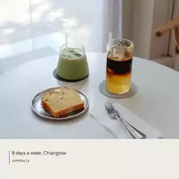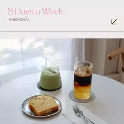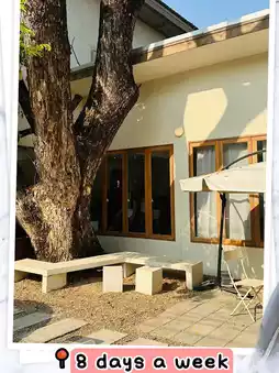 8 Days a Week, a super chic minimalist cafe in Nimmanhaemin, Chiang Mai. It is easily accessible and has parking on the side. The atmosphere of the shop stands out with its minimalist style, bright white and brown tones, easy on the eyes, and beautiful natural light for taking photos. It is suitable for both working and hanging out. There are both air-conditioned and open-air areas. There are many photo spots and it is also pet-friendly.