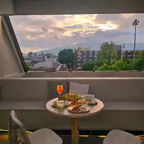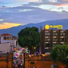 The atmosphere is great, with views of the mountains and Tha Phae Gate, making it one of the most beautiful spots. The atmosphere is even more beautiful at night.