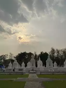 A peaceful temple in the heart of the city, featuring a large, striking golden stupa and several white stupas arranged in a serene and sacred manner. The atmosphere inside is quiet, making it perfect for relaxing, taking photos, or praying for blessings.