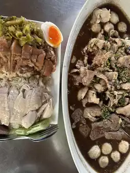 ❗️The restaurant's highlight is its giant specialty menu items, such as a large-sized chicken rice bowl for around 199 baht. Perfect for those who are very hungry or come with a large group, the atmosphere is clean and trustworthy, and the well-organized noodle counter is quite popular. Customers often line up, indicating its high quality and deliciousness. The main menu item is delicious boat noodles. There are also a la carte rice dishes and pork leg rice.