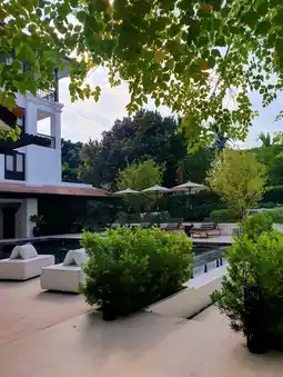 The hotel features a swimming pool in the middle of a garden. It was clean, beautifully designed, and perfect for taking photos. Nearby, there's a spa called Makkha with reasonable prices, which I used every day during my stay.
