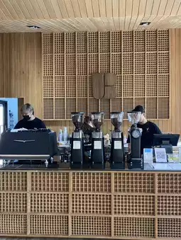 The cafe features a minimalist style, blended with the warmth of wood. There are tables scattered throughout the air-conditioned room and an outdoor area that catches the cool mountain breeze. The morning air is especially clear, allowing soft light to filter through the leaves, making it a perfect place to work or read.