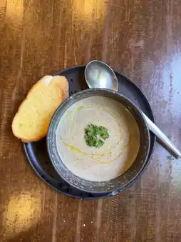 Located in a home, the atmosphere is homey and friendly, decorated in bright, soothing tones. Surrounded by trees, it creates a shady and relaxing atmosphere. A small pond at the entrance offers a cozy atmosphere, perfect for dining with family, a special someone, or a group of friends.