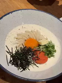 This is a very good fresh udon noodle shop. The udon with creamy fish egg sauce is very good. The udon noodles are soft and chewy and go very well with the sauce. The fried pork tonkatsu is also very good, crispy and fragrant. The gyoza are also delicious. Personally, I think the carbonara is a bit too greasy. Next time, the beef is very good. Good meat, good rice, good soup. Overall, this shop is very good. It's another favorite shop in Chiang Mai. I want everyone to try it. It's really good. The mousse is also very good. Next time I go to Chiang Mai, I will definitely go back again. #VisitChiangMai