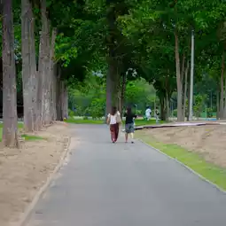 🌿 The surroundings are filled with large trees providing cool shade and a constant breeze, making it a truly relaxing place to walk or sit. In the evenings, you'll find locals gathering here for exercise, sports, family outings, or even picnics on the grassy lawns.