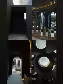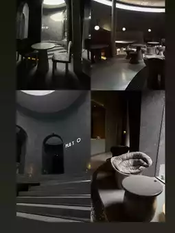This dark-toned cafe offers a coffee experience amidst cutting-edge architecture.
