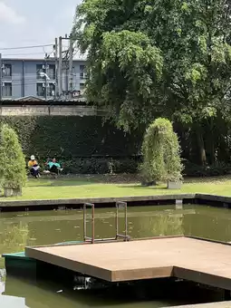 ✨ The highlight here is the variety of seating areas to choose from — chill inside the wooden house, relax on the lawn with a view of the lotus pond, or choose the deck area with power outlets for convenient work. There's even a cute duck strolling through the garden.