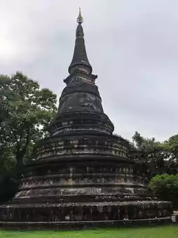 Archaeologists believe it was built around the beginning of the 20th Buddhist century. It is a bell-shaped chedi with approximately three circular tiers resembling stacked lotus petals, topped with a spire. In front of the tunnel is a carved stone Buddha head from the Phayao style, dating from 1457 to 1557 CE.