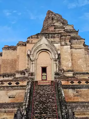 Wat Chedi Luang Viharn houses the largest chedi in Chiang Mai Province. It was built during the reign of King Saen Mueang Mak, the seventh king of the Mangrai Dynasty. Later, Phraya Tilokarat granted royal patronage. The craftsmen had to expand the pagoda to be taller and wider than before and invited the Emerald Buddha to be enshrined there for a period of 80 years. Later, in 1545 during the reign of Queen Jiraprapa, an earthquake occurred, causing the top of the pagoda to collapse.