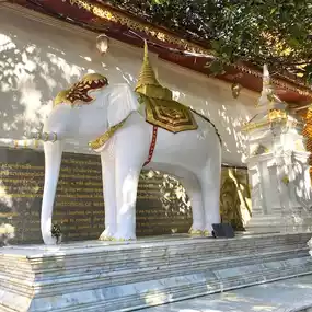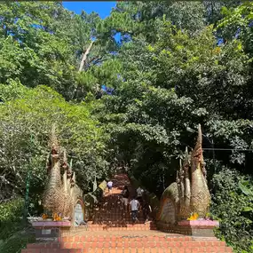 Wat Phra That Doi Suthep features a seven-headed naga staircase made of cement, with approximately 300 steps. Alternatively, you can take the cable car up to pay homage to the chedi.