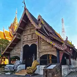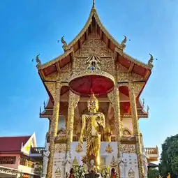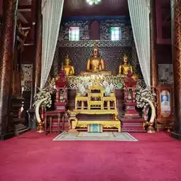 🏠The main viharn, in Lanna style, was built by King Kawilorot Suriyawong, decorated with Burmese stucco patterns. Inside, the Buddha Maha Patimakorn, in Lanna style, is cast in bronze. It is flanked by two Chiang Saen-style Buddha images, both cast in bronze, and features murals depicting the life of the Buddha.