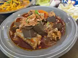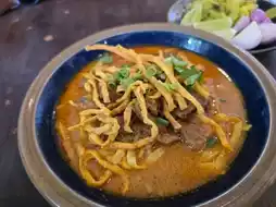 Atmosphere: Clean, not crowded, with plenty of tables. At first glance, there are probably around ten tables. The interior is decorated with wooden furniture, reminiscent of an old house. There's a wooden archway at the entrance, giving it a Lanna-style atmosphere. There's also a picture of a woman on the wall, the originator of Chiang Mai Khao Soi. Her name is Lamduan, just like the restaurant itself. This long-established restaurant boasts a long history.