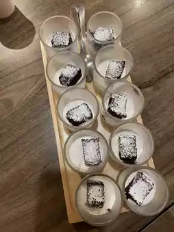 • 🥄 Brownie Shot (~฿149) – Signature! Rich brownie served with fresh milk cream. 🍶
