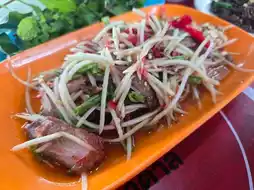 The restaurant serves local cuisine. We ordered the cooked beef larb, which was incredibly delicious. The unique flavors are unique to the larb, unlike Isaan-style larb, giving it a distinct aroma and a distinct flavor. The spicy beef soup is highly recommended. The beef is incredibly tender, melt-in-your-mouth, and the flavors are well-balanced and sour. And most importantly, the portions are generous. You can order it in a bowl or a hot pot. Another dish we ordered was the grilled pork neck som tam, which was inspired by Korat, but with the addition of delicious grilled pork neck. It was served with hot sticky rice. Everything was delicious. The menu also offers a wide selection of fried dishes, spicy salads, and om soups. There's a wide variety of beef, chicken, pork, fish, and even a special buffalo dish. The atmosphere is relaxed and welcoming, and customers keep coming back. If you're in the area, I highly recommend it.