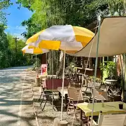 Located in the forest, surrounded by nature, with trees, bamboo, and sunlight.