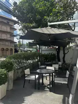 Luxury yet Chill: The restaurant's modern black and white décor exudes elegance and sophistication, yet offers a relaxing atmosphere with an outdoor poolside area, perfect for relaxing and chilling.