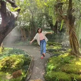 The interior is decorated in a tropical Thai moss garden style, with a variety of plants and a waterfall, creating a refreshing atmosphere throughout the entire space.