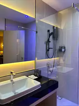 I was very impressed! I loved it! The parking lot was spacious, and the hotel's theme was adorable, with lots of moose everywhere. The details were great. The room was beautiful and clean, and the bathroom was nice. The walls and doors were very soundproof, with no noise at all. In the morning, a breakfast box (food, fruit, water, orange juice) was provided. The TV had YouTube and premium channels, an air purifier, and all the necessary amenities were provided. There was also a shuttle to Central. It was very close, and there were free snacks. P.S. I wish the blue lights in the bathroom could be turned on and off separately, lol.