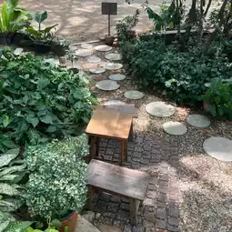 There are wooden seats in various corners.