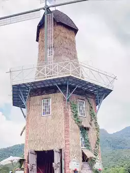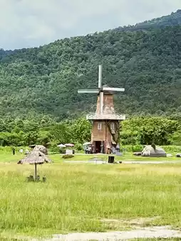 Just outside Chiang Mai, a surreal landscape awaits! Imagine emerald green hills dotted with towering white windmills, their giant blades cutting through the mountain breeze, while playful hippo sculptures peek out from flower gardens.