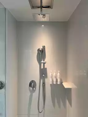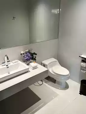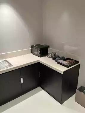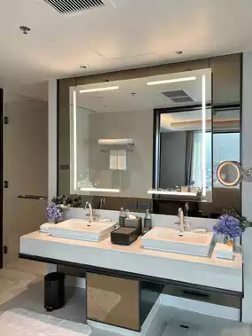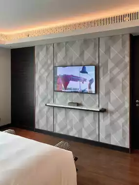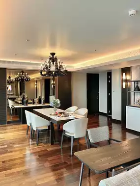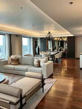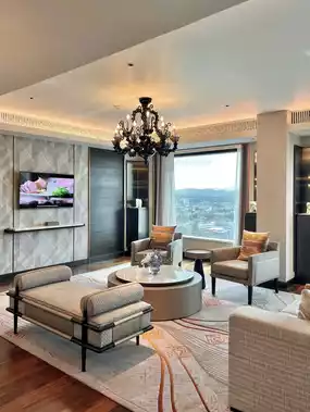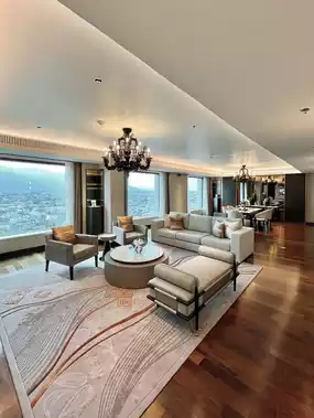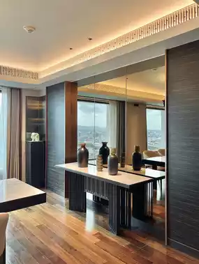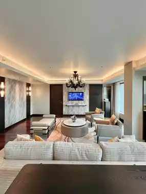 Some parts of the suite have been newly renovated to appear more modern and luxurious. Certain pieces of furniture have been replaced, while others have been refurbished to better match the room's aesthetic. However, three areas remain unrenovated: the bathroom, dressing room, and kitchen. These areas retain their original design from before the rebranding, though new appliances have been added, such as a Dyson hairdryer, which adds a premium touch.