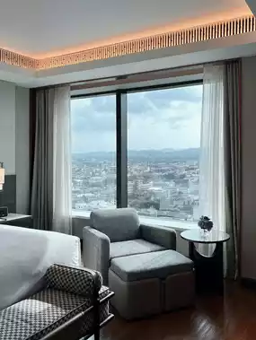 The Diplomatic Suite spans 144 square meters and is incredibly spacious, especially the living room area. My favorite feature of this suite, aside from its large size, is the view of Doi Suthep, which offers a nearly full view of the mountain. This stunning view can be enjoyed from all the main areas of the suite, including the bedroom, living room, and bathroom.