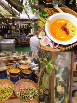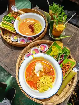 🍜 Khao Soi "Yook Samai" is a restaurant in a house next to a temple that's been open for several years. Recently, it's become a frequent sight among tourists, as they've recently started making Khao Soi. The striking feature of the storefront is the display of freshly boiled Khao Soi, ready to be boiled and the pork cooked fresh. The presentation is truly impressive, with every bowl served in a winnowing basket, arranged with garnishes on lotus leaves and bamboo cylinders. The presentation deserves a 10. If you come around lunchtime, you might have to find a seat, as it can get very crowded. Besides Khao Soi, they also offer stir-fried basil with rice, fried pork with rice, beef panang curry with rice, shrimp paste fried rice, and braised pork belly with rice.