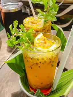 📸 Prices may be a bit high, but for tourists, this presentation is worth it. Drinks can be ordered separately at the counter. Popular favorites include passion fruit juice and Thai tea, served in stylish banana leaf cups.