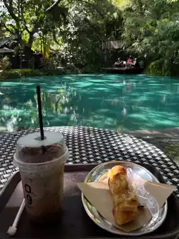Today, I opted for my favorite menu item, a hot latte ☕️. The coffee here does not disappoint, with a perfectly balanced rich flavor and the delightful aroma of coffee and creamy milk blending harmoniously. Sipping a warm latte in such a relaxing setting, accompanied by soft background music and the view of the clear blue pond, feels like a complete retreat. It's a perfect way to recharge on a day off.