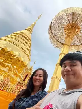 Wat Phra That Doi Suthep is a temple that I have visited many times since I was a child. If I visit Chiang Mai with a tour, the guide will take me here every time. It is not far from Chiang Mai Airport. I will come to pray before flying back home. I drive myself up to Doi Suthep, which takes 20 minutes. If the road is clear and not a festival, the road is big and very well-made. It is easy to drive up the mountain. During the Covid period for the past 2 years, it is even clearer. There are not many tourists. The atmosphere is good and more peaceful because you don't have to crowd together to worship.