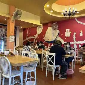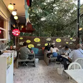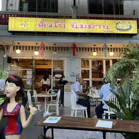 🏬 The shop's yellow sign is clearly visible. Then, we chose to reserve a seat before ordering food. In fact, in addition to chicken stir-fry, the shop also has other menus.