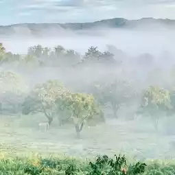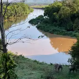 View of the curve of the Ruak River, grasslands, forests, and a herd of elephants in the mist.