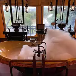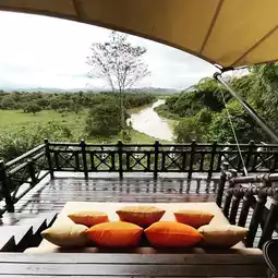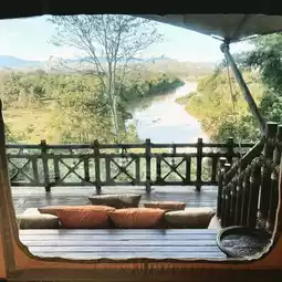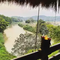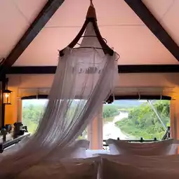 Located on a hill in a natural forest, near the Golden Triangle, Chiang Saen District, Chiang Rai Province, in front of you will see the scenery of both Myanmar and Laos. The view is beautiful “like a painting”, especially from Tent No. 2 (Superior Riverview Tent Hill Tribe). This room has a clear view of the river bend, beautiful at all times, and a clear view of the herd of elephants. Whether from the bed, bathtub or balcony, you will see a wide and distant view of the grassland, the forest of big and small trees, and the herd of elephants that the resort takes care of itself. Beyond the grassland is the Ruak River, orange-red, which is the natural border between Thailand and Myanmar. All the elements are so beautiful that many travelers dream of coming here.