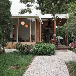Today, I will take everyone to a cafe that I really like. This cafe is decorated in white, Japanese style, warm style, hidden in the forest amidst nature, next to the Mae Korn River. There are seats by the river with a very good atmosphere. I like that there is a river (the shop is next to Aso coffee). I came here last year and it was still a small shop. This year, they have completely renovated it, making it very beautiful. They will divide it into two zones: the air-conditioned indoor zone and the outdoor zone outside, which is a zone that fully receives the natural atmosphere. The shop is very shady with many trees, so I can tell you that the air is definitely good.