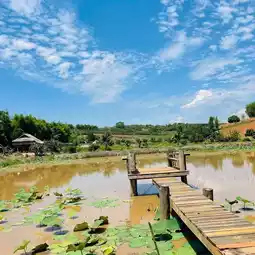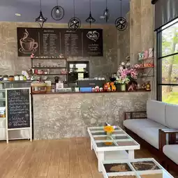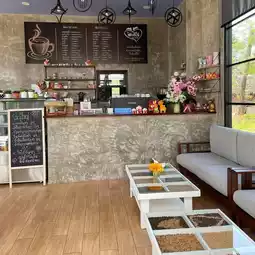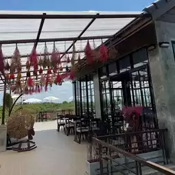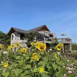 Today, we will take everyone to visit a coffee plantation that I can tell you has a very good atmosphere. It is called Rai Hug Tee Jai. It is a coffee plantation located in a private flower garden. I will tell you that the flower garden is very big. And the shop has arranged many corners for taking pictures, whether it is sunflowers, lotus ponds, or a grass tunnel arch. This shop has decorated many corners for us to take pictures. People who like taking pictures should not miss it. Let's take a look at the drinks and food. Let me tell you that this shop's drinks have its own coffee plantation. The shop roasts every single coffee bean, giving it a unique taste unlike any other shop. As for the cakes and bakery breads here, they are homemade. The shop makes everything fresh every day. When you come to Chiang Rai, don't forget to check in at this plantation. I guarantee you won't be disappointed. And most importantly, I recommend coming in the evening to sip coffee and watch the sunset. I can tell you that it's the best.