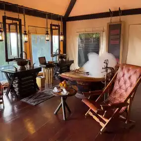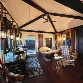 Not only that, the bathtub is in the middle of the tent. Good quality materials, classic structure. The bathroom is inside the tent. You can enter and exit with 2 layers of zippers for privacy. The shower is outdoor. Experience the natural tropical rainforest atmosphere.