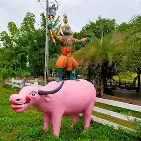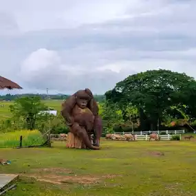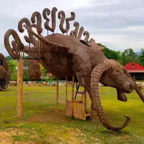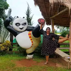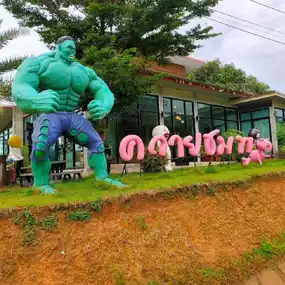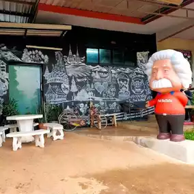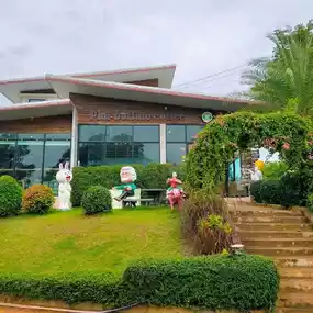 If anyone has a chance to go to Chiang Rai, while heading to Phu Chi Fa, Bomiko has a cute cafe to recommend. Pink Buffalo Coffee, a coffee shop with food and a great atmosphere of the shop next to a wide rice field, alternating with mountains. And around the shop, there are many buffalo statues, which is the identity of the shop. And there is also a view looking down to see the wide rice field, contrasting with the small mountains like a painting.