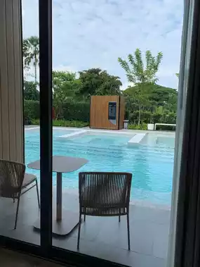 The rooms here have complete facilities and, most importantly, are very clean because this place just opened. For those who like to soak in a jacuzzi, this place also provides services for guests. In the common area, there is also a fitness center, a large swimming pool next to the natural view. I must say that this place has a lot of photo corners.