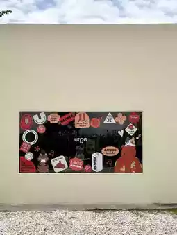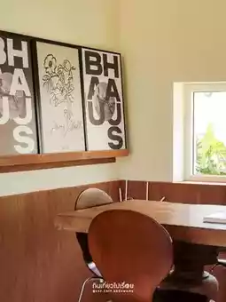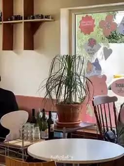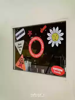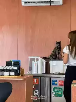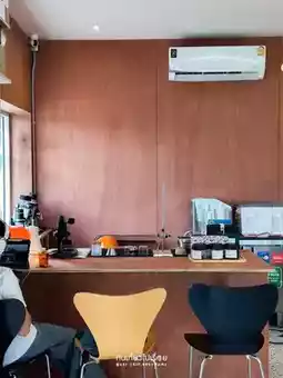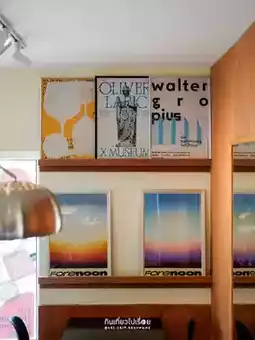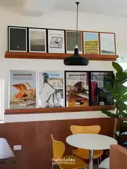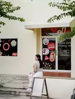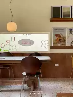 #ChiangraiTravel Urge, a cafe in Chiang Rai, owned by a cat🐱 The shop is a square cream-colored block with cute stickers on the glass. The mood and tone inside are comfortable, like eating snacks at a friend's house. Most of the decorations are framed with various pictures.
