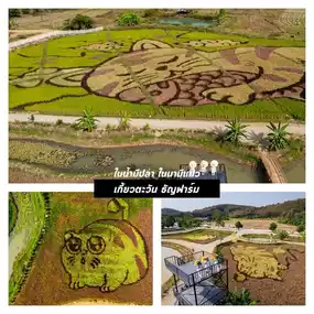 4. Rice field art "In the water there are fish, in the field there are cats" This piece should please many people because of the cuteness of the Japanese-style cat that uses colorful rice to arrange until the green rice field becomes a cute, brightly colored cat that is great for taking pictures. This piece is located at Rai Kiew Tawan, Than Farm, Ban Khon Sung, Tambon Ngio, Amphoe Thoeng, Chiang Rai Province as well. This piece is so famous that it was reported in the news by foreign media.