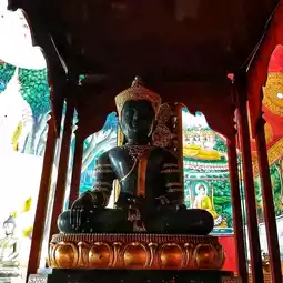 🙏 In front of the principal Buddha image, there is the Phra Phuttha Si Ming Mongkhon, a small bronze Buddha image in the Mara-Vijaya attitude, an ancient Buddha image in the Chiang Saen Singh Song art style, around the 21st Buddhist century.