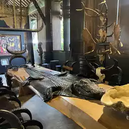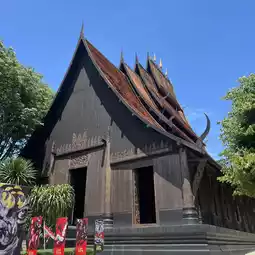 Finally, we ventured to the Black House, or Baan Dam Museum, a striking contrast to the previous temples. The dark, almost gothic architecture and deep black tones gave the space a mysterious and powerful aura. The textures here were rougher, with aged wood, animal hides, and bone elements incorporated into the design. The scent of aged wood and leather permeated the air, adding to the temple’s ancient and enigmatic feel. The Black House challenged our perceptions of beauty and spirituality, offering an experience that was more introspective and profound than the often more ornate and vibrant temples of Bangkok.