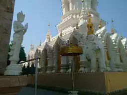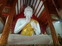 .. The entrance gate features a pair of majestic white lions, and you can see the beautiful main vihara, which houses the Buddha of Omniscience.