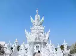 - White Ubosot, outstanding with bright white and intricate stucco patterns, conveying the purity of the Buddha. The use of decorative mirrors reflects sunlight, creating an indescribable beauty.