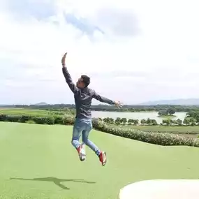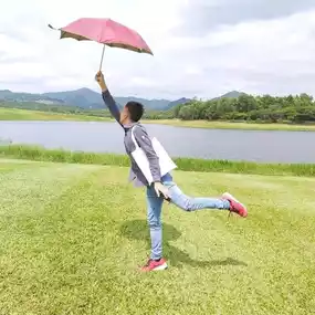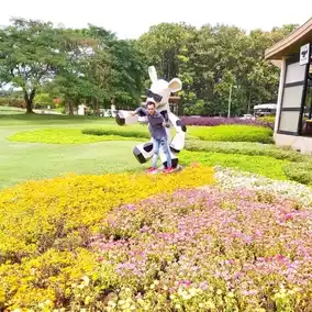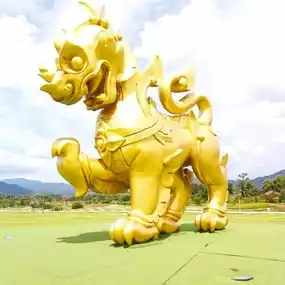 The highlight that you have to take a selfie with is the golden lion statue in front of you, plus the green grass and the sky. There are blue and white clouds, and dimmer light. It's a very impressive picture.