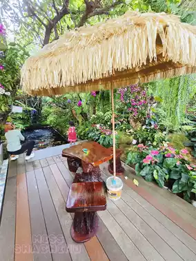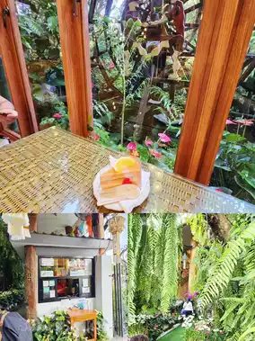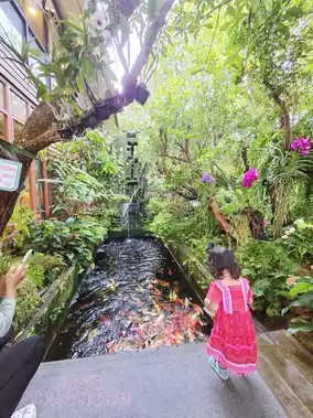 ♥ This cafe is like being surrounded by a tropical rainforest, with colorful flowers and trees in every corner 🌳 There is also a quite spectacular waterfall inside, you must go ah, it is a pity not to go 🩷