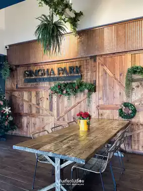 #tripพาบินเที่ยวจีน Singha Park Cafe is located in front of Singha Park Chiang Rai. It is a cafe that is perfect for relaxing after walking around the farm. The atmosphere is warm, with a view of the lawn and beautiful sculptures. The recommended menu is the signature drinks of the shop, such as coffee and matcha. Or choose a dessert like freshly made homemade cake, which goes well together. The surrounding area of the shop is spacious, suitable for chilling with friends or bringing your family to experience a comfortable atmosphere on a holiday. Anyone who comes to visit Singha Park Farm, don't forget to stop by here to recharge.