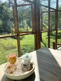 The shop is located not far from Mueang Chiang Rai District. It is easy to get to. The atmosphere is great! The shop is a glass room with transparent light. Natural light shines beautifully in every corner. Taking pictures is great. It is perfect for sipping tea while enjoying the green view.